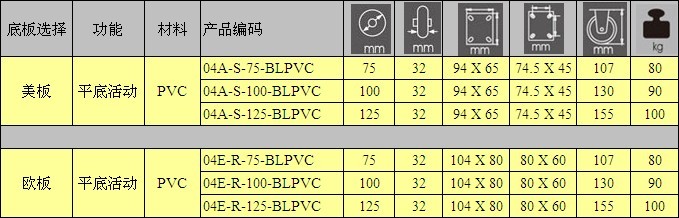 所有04系列产品从3"-5",均有美板和欧板底板尺寸,轮子可选择单轴或双轴,可自由选择材料为PVC,TPR,PU,PP,橡胶等,只要达到最少订量要求均可选择任何颜色的轮子。支架电镀可选择镀锌,电泳黑架,镀铬。
